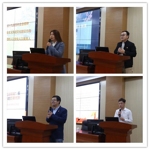 不同于以往的宣讲形式,此次党课首先请文化传播与设计学院党总支书记陈晓兰、党务工作者代表刘晓亮、青年骨干教师代表金一强、学生党员代表陈峰等4名党员分别从不同角度汇报了学习党的十九届四中全会精神的心得体会。陈晓兰书记依托学习强国平台的多形式学习,从文化自信的角度深情地诠释了根植中国大地5000年深厚底蕴的民族之魂力量之强;党员博士刘晓亮、教授金一强则从国家制度和治理体系优势角度详细阐述了中国特色社会主义制度自信的源头所在;17级学生党员陈峰结合自身学习生活实际跟大家分享了校园生态文明建设的点点滴滴。