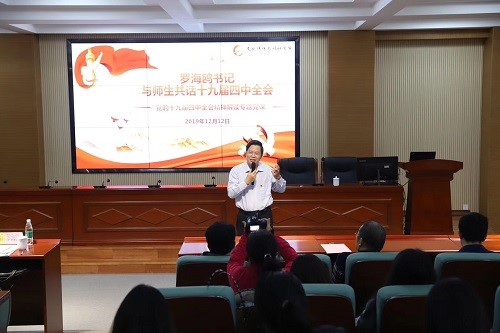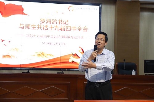 12月12日下午,大雪节气到来后的冬日气温骤降、寒意袭人,但学校中山校区学术报告厅内气氛热烈、暖意融融。学校党委书记罗海鸥正在这里给师生讲专题党课,与他们共话党的十九届四中全会,深入解读学习全会精神,展望国家治理正在迈向的更高境界。党课形式新颖、内容丰富,吸引了文化传播与设计学院全体教职工、学生党员和入党积极分子及党政办、学生工作部、团委等部门负责人共160多人参加学习。