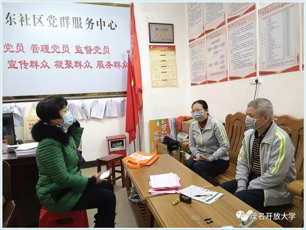 茂名开大党委书记、校长董艳清(中)听取社区疫情防控工作情况汇报