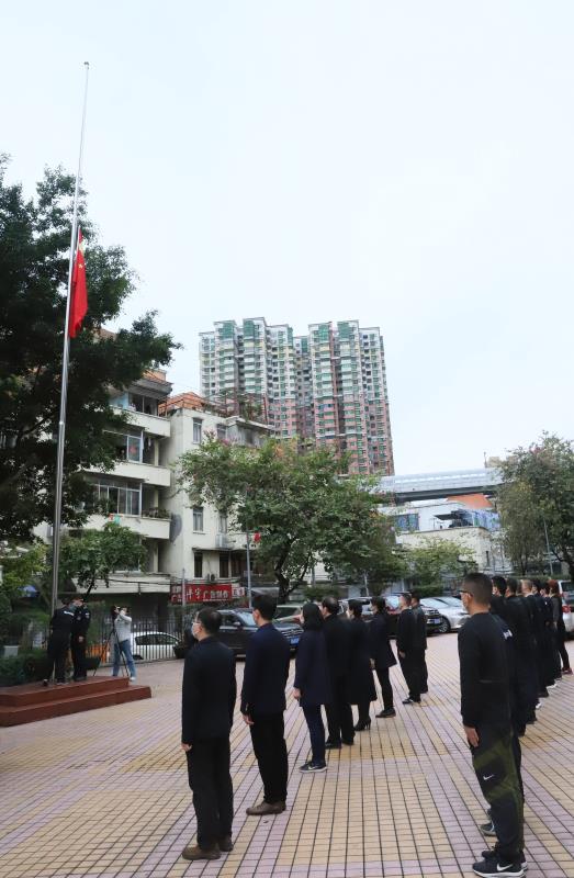 9时58分,干部师生们身着深色正装,神情凝重,在国旗广场整齐肃立,举行庄重的升旗和降半旗仪式。10时整,伴随着长鸣的防空警报声以及汽车鸣笛声,全体师生默哀3分钟,向抗击新冠肺炎疫情斗争牺牲烈士和逝世同胞致以哀悼。
