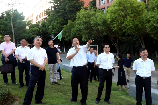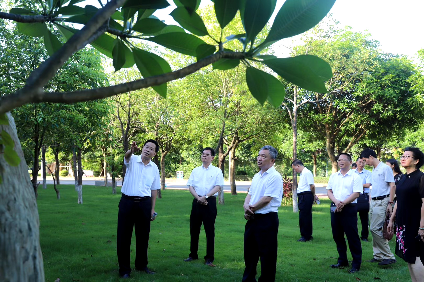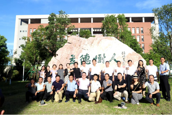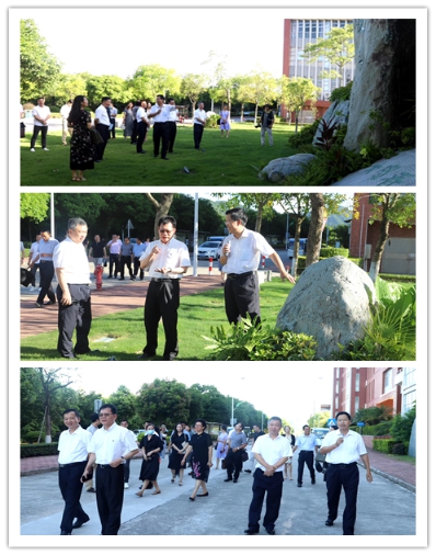 会后,罗书记陪同客人从开宗明义阐明中国高等教育总规律的“大学之道”景石开始,沿着中国历史文化和教育思想发展的脉络,一路品赏了以老子、孔子、董仲舒、朱熹、蔡元培等至圣先贤为代表的国学园,具象神似昆仑及黄河长江的溯源广场。在轻松愉快的氛围中,罗书记道说了文化景观营造背后那些耐人寻味的故事,解说了景观蕴含的文化的“根”、教育的“本”和技术的“魂”。在“立德树人”景石前,来宾们凝望着九十高龄教育大家顾明远先生苍劲有力的题字,无不为其撼人心魂的教育精神所折服。来到犇犇广场,来宾们看到负重前行但又“敢为天下先”的石龟,气势如虹比牛更牛的“犇犇”都大为惊叹,盛赞其“形意与神兼具”。折转到中山园,曾获矛盾文学奖的中山人、文艺名家刘斯奋先生题写的“非学问无以建设”尤为瞩目,警醒着所有的参观者,要传承孙中山先生的“学问精神”。