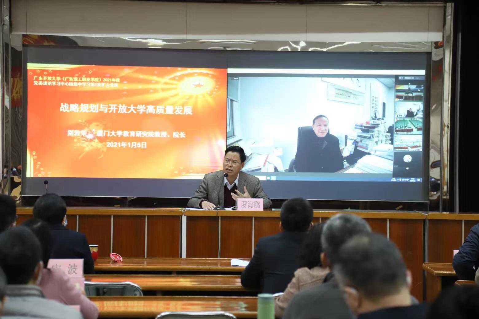 党的十九届五中全会擘画了“十四五”和全面建设社会主义现代化国家的宏伟蓝图。在新发展阶段,如何不断提高贯彻新发展理念、构建新发展格局能力和水平,为实现学校高质量发展提供根本保证?新年伊始,1月5日下午,学校召开2021年党委理论学习中心组第1次学习(扩大)会议,集中学习谋划“十四五”发展规划,著名高等教育专家、厦门大学教育研究院院长、博士生导师别敦荣教授受邀在线作专题辅导报告。校领导、党委中心组成员、正高职称人员在广州及中山校区现场学习,其他中层干部,市、县开大(电大)领导,学校“十四五”规划各工作小组成员,规划与体系建设处全体人员以及相关人员线上参加学习。学校党委书记罗海鸥主持会议。