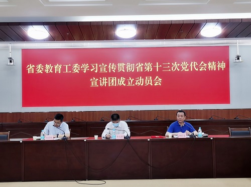 为深入学习贯彻省第十三次党代会精神,教育引导全省教育系统广大党员干部师生切实把智慧和力量凝聚到党代会提出的目标要求和工作任务上来,6月27日下午,省委教育工委召开学习宣传贯彻省第十三次党代会精神宣讲团成立动员会。省委教育工委副书记、省教育厅党组副书记李大胜出席会议并讲话。省委宣讲团成员、省第十三次党代会代表、学校党委书记刘启宇作宣讲工作介绍。