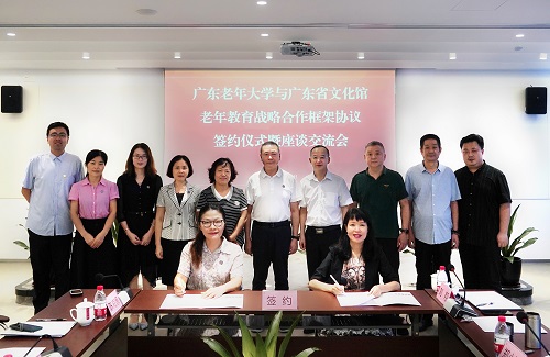 7月12日上午,广东老年大学与广东省文化馆老年教育战略合作框架协议签约仪式在省文化馆举行。学校党委书记刘启宇,学校党委委员、副校长王宜奋,省文化和旅游厅一级巡视员陈杭、二级巡视员屈其仁出席签约仪式。