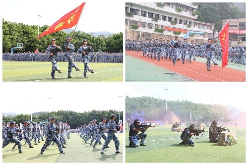 典礼展示了2023级新生军训成果。军训团先后进行了分列式阅兵、军体拳、短棍术、擒敌拳、警棍盾牌操、匕首操、刺杀操、战术方块等军训科目汇报表演。他们精神饱满、队列整齐,步伐坚定、号声嘹亮,动作标准、气势如虹,有力展示了半个月刻苦训练带来的蜕变与成长。